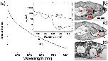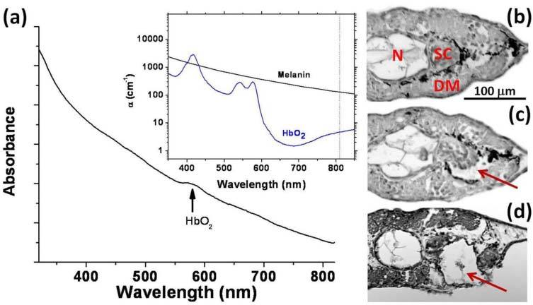 Fig. 2. (a) Absorption spectrum from a paste made of Xenopus tails and diluted in deionized water. Arrow indicates peak likely due to hemoglobin. The inset plots the absorption spectrum of melanin and oxygenated hemoglobin and the dashed line indicates the laser wavelength. (b) Histology section of undamaged tadpoletail (24 hpa) showing location of the notochord (N), the melanocytes surrounding the spinal cord (SC) and the dorsal muscle (DM). (c) Another section of the same tail where the red arrow points to absence of a melanocyte after laser treatment for one insult, i.e., shutter duration of 200ms and laser fluence of 26 mJ/cm2. (d) Section showing damage to SC and DM after multiple laser insults to melanocytes.