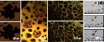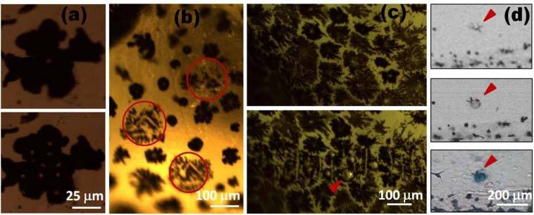 Fig. 3. Different methods to mark melanocytes. (a) Top image is a melanocyte located on anterior dorsal side of a stage 46 Xenopus before laser ablation and the bottom image shows multiple ablated spots after a laser fluence of 2 mJ/cm2 and a shutter duration of 10 ms. (b) Tagging of individual melanocytes located near the tadpole’s eye with triangles using a fluence of 2 mJ/cm2 and scan speed of 50 µm/s. (c) Before and after images of lines drawn on a dark wild-type stage 36 Xenopus for a 14 mJ/cm2 fluence and 150 µm/s scan speed. The red marker points to a long-lasting cavitation bubble. (d) Top image of melanocyte located on dorsal fin before laser ablation, middle image is the melanocyte after laser irradiation at 26 mJ/cm2 and shutter duration of 200 ms, and the bottom image shows a dark blue coloring of the ablated area, after bathing the Xenopus in the vital stain trypan blue, which indicates cell death.