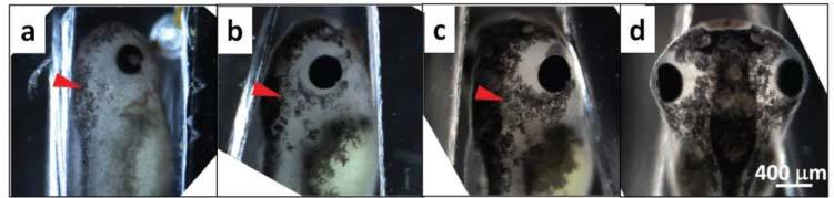 Fig. 4. Images of melanocyte migration after clearing a large area of melanocytes using laser ablation (raster scan with line spacing of 5 μm, F = 6 mJ/cm2, scan speed = 150 μm/s). Red arrowheads indicate the position of ablation (a), 19 hrs later (b), and 28 hrs later (c). (d) shows a dorsal image comparing the left (nonablated) and right (ablated) side of the Xenopus 28 hrs after laser ablation.