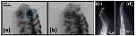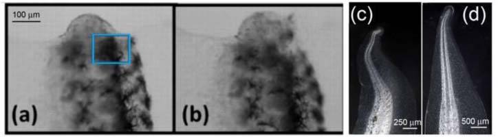 Fig. 5. Tail regeneration after targeting the spinal cord. (a) Image of the position where the tail was amputated from a stage 40 Xenopus tadpole. The blue box highlights the region targeted by the laser. (b) Image after targeting laser in 10 locations inside blue box with laser fluence of 26 mJ/cm2 and a 200 ms shutter duration. The dark melanocytes that were targeted are gone. (c) An image showing the same tail after 1 week. (d) The normal shape of a regenerated tail.
