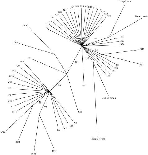 A consensus, unrooted, neighbor-joining tree representing the phylogenetic relationships between 55 sequenced individuals is shown. The UNC Nigerian F5 strain is represented by four individuals, the genotyped parents of the group 1 and group 2 animals previously analyzed. The Ivory Coast F8 and commercial Nigerian F5 individuals are labeled IC1-22 and N1-29 respectively. The bootstrap values are shown alongside the branches, indicating the number of times the partition of the individuals into the two sets separated by the branch occurred amongst the 100 trees on which the consensus tree is based.