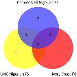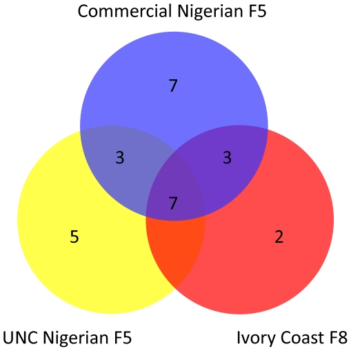 Figure 1. Overview of shared and unique polymorphism amongst sequenced strains.This Venn diagram summarizes the pattern of shared and unique polymorphism between the UNC Nigerian F5, commercial Nigerian F5 and Ivory Coast F8 inbred frogs genotyped for 28 polymorphisms in 12 polymorphic genes.