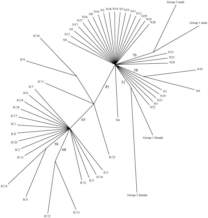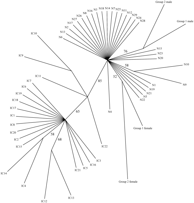 Figure 2. X. tropicalis strain phylogeny.A consensus, unrooted, neighbor-joining tree representing the phylogenetic relationships between 55 sequenced individuals is shown. The UNC Nigerian F5 strain is represented by four individuals, the genotyped parents of the group 1 and group 2 animals previously analyzed. The Ivory Coast F8 and commercial Nigerian F5 individuals are labeled IC1-22 and N1-29 respectively. The bootstrap values are shown alongside the branches, indicating the number of times the partition of the individuals into the two sets separated by the branch occurred amongst the 100 trees on which the consensus tree is based.