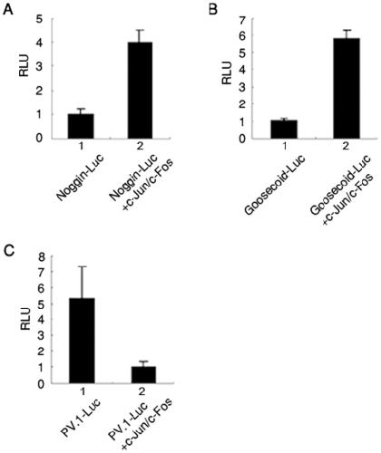 Figure 2. AP-1 enhances promoter activity of activin response genes, but reduces that of BMP4-response gene.(A–C) Luciferase assay using animal caps (at stage 10.5 equivalent). Indicated mRNAs or expression plasmids were used: lane 1, Noggin, Goosecoid, or PV.1 promoter luciferase reporter gene; lane 2, co-injection with 1 ng of mRNAs encoding AP-1 (c-jun and c-fos). All values are averages of at least three independent experiments. RLU, Relative luciferase activity.