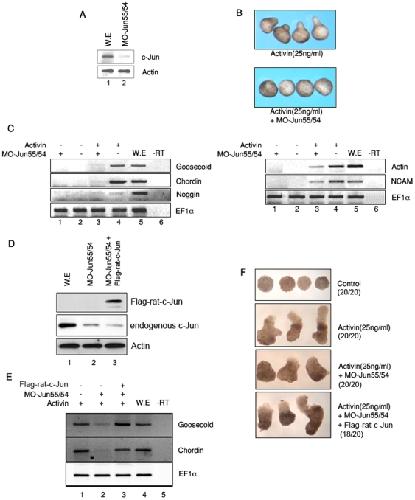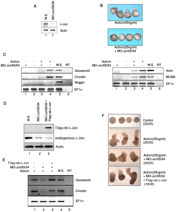 Figure 3. AP-1 is required for activin signaling.(A) MO-Jun55/54 (20 ng of MO-jun55 and 54) specifically inhibit the translation of endogenous c-Jun. (B–C) Animal caps isolated from embryos injected with or without MO-Jun55/54 were cultured until stage 10.5 or stage 24. (B) The morpholino oligonucleotide Juns (MO-Jun55/54) inhibited morphological change induced by activin. (C) RT-PCR analysis of animal caps injected with the indicated MO-Jun55/54 or treated with activin (25 ng/ml). MO-Jun55/54 suppressed the markers induced by activin signaling (lane 3 and 4). (D–F) Animal caps isolated from embryos injected with or without MO-Jun55/54 and mRNA of Flag rat c-Jun were cultured in presence of activin until stage 10.5. (D) Inhibition of endogenous c-Jun and Flag rat c-Jun translation were confirmed by western blotting. (E) RT-PCR analysis of animal caps. Co-injection of rat c-Jun rescued the organizer genes suppressed by MO-Jun55/54. (F) The phenotype of animal caps inhibited by MO-Jun55/54 was rescued by co-injection of rat c-Jun mRNA. 20 embryos that had received a microinjection of indicated mRNA or MOs were used for animal cap isolation at the blastula stage. We presented the number of animal cap's phenotype for each group. EF-1α, a loading control; -rt, control reaction without reverse transcriptase; cont, animal caps sample dissected from non-injected embryos; we, whole embryo as a positive control; organizer genes, chordin, noggin and goosecoid: later dorsal mesoderm marker, Actin; neural marker, N-CAM.