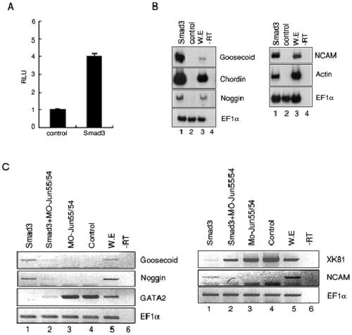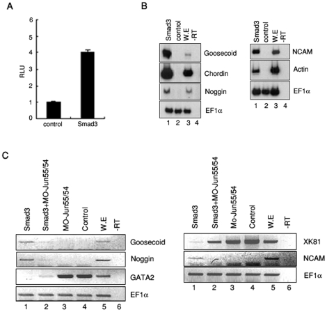 Figure 5. AP-1c-Jun/c-Fos is involved in Smad3-mediated organizer gene expression.(A) (AP-1)4-luciferase assay using animal cap explants injected with Smad3 mRNA. Smad3 enhanced the AP-1 activity. (B–C) RT-PCR analysis of animal caps expressing the indicated mRNA of Smad3 or MO-Jun55/54. (B) Smad3 induced organizer genes (goosecoid, chordin and noggin), later dorsal mesoderm marker (Actin) and neural marker (NCAM). (C) MO-Jun55/54 suppressed Smad3-induced organizer genes (goosecoid andnoggin) at stage 10.5 and neural marker (NCAM) at stage 24. On the other hand, ventral mesoderm marker (GATA2) and non-neural marker (XK81) were increased by co-injection of MO-Jun55/54 and Smad3 mRNA. EF-1α, a loading control; -rt, control reaction without reverse transcriptase; cont, animal caps sample dissected from non-injected embryos; we, whole embryo as a positive control.