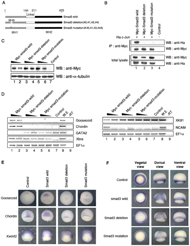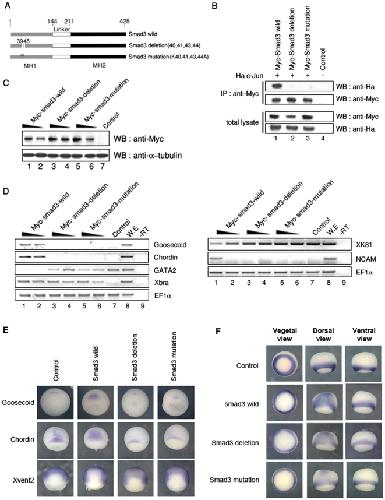 Figure 7. Physical interaction of Smad3 and AP-1 is necessary for full activation of organizer genes, but not for Xbra.(A) Schematic representation of Smad3 constructs used in this study. (B) Immunoprecipitation assay of c-Jun and wild Smad3 or Smad3 mutants. Co-immunoprecipitation of Smad3 mutants and c-Jun was not seen (lane 2, 3). (C–F) Whole embryos injected with indicated mRNAs or isolated animal caps were cultured until stage 10.5 and stage 24. (C) Embryos injected with indicated mRNA were lysised and performed western blot with anti-Myc for confirmation of mRNA expression. Injected mRNA of Smad3 mutants and wild type was translated into proteins in a dose-dependent manner. (D) RT-PCR on animal caps expressing indicated mRNAs. Unlike wild Smad3 (lane 1–2), Smad3 mutants lost inducing activity of organizer genes and neural specific marker (lane 3–6): EF-1α, a loading control; -rt, control reaction without reverse transcriptase; cont, animal caps sample dissected from non-injected embryos; we, whole embryo as a positive control; organizer gene, chordin and goosecoid; pan-neural marker, N-CAM; ventral mesoderm marker, GATA2; epidermis marker (non-neural marker), XK81; pan-mesoderm marker, Xbra. (E) Embryos injected with indicated mRNAs (upper panel) were processed for whole mount in situ hybridization with indicated markers (left panel). (F) Embryos injected with indicated mRNAs (left panel) were processed for whole mount in situ hybridization with Xbra.