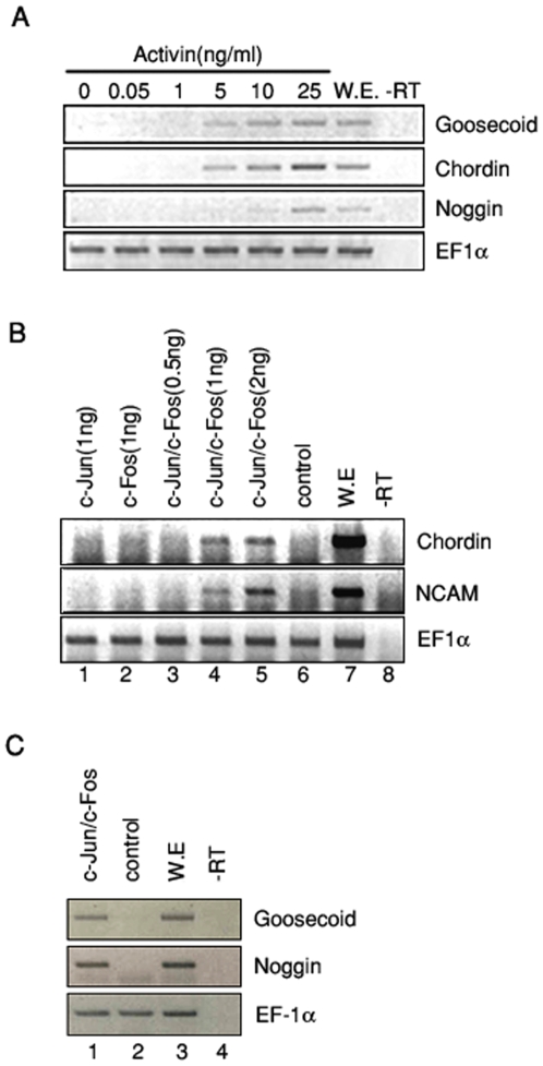 Figure 1. AP-1 functions similar to activin in dorsal mesoderm and neural gene expression in animal cap explants.(A–C) RT-PCR analysis of organizer genes (chordin, noggin and goosecoid) or late neural specific marker (N-CAM) in activin treated animal cap explants or in mRNAs encoding c-jun or/and c-fos injected animal cap explants. (C) Animal caps isolated from embryos injected with 1 ng of mRNAs encoding c-jun and c-fos was used for RT-RCR analysis. EF-1α, a loading control; -rt, control reaction without reverse transcriptase; cont, animal cap samples obtained from non-injected embryos; we, whole embryo as a positive control.