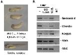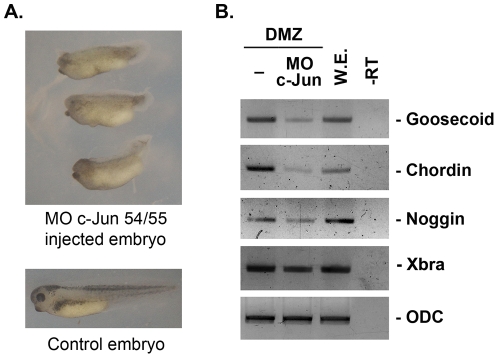 Figure 4. Physiological role of AP-1 in whole embryo.(A) Embryos were injected with 20 ng of MO-Jun54/55 into animal regions of one- or two-cell stage embryos and cultured until stage 40. c-Jun depleted embryos showed short axis and disrupted anterior structure. (B) Marginal zone of two dorsal blastomeres (DMZ) of four-cell stage embryos injected with 20 ng of MO-Jun54/55 was isolated and cultured until stage 11. Spemann organizer genes (noggin, goosdcoid and chordin) and mesoderm marker (Xbra) were investigated by RT-PCR analysis. The organizer genes expressed in DMZ were significantly reduced by depletion of c-Jun. ODC, a loading control; -RT, control reaction without reverse transcriptase; W.E., whole embryo as a positive control.
