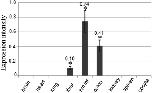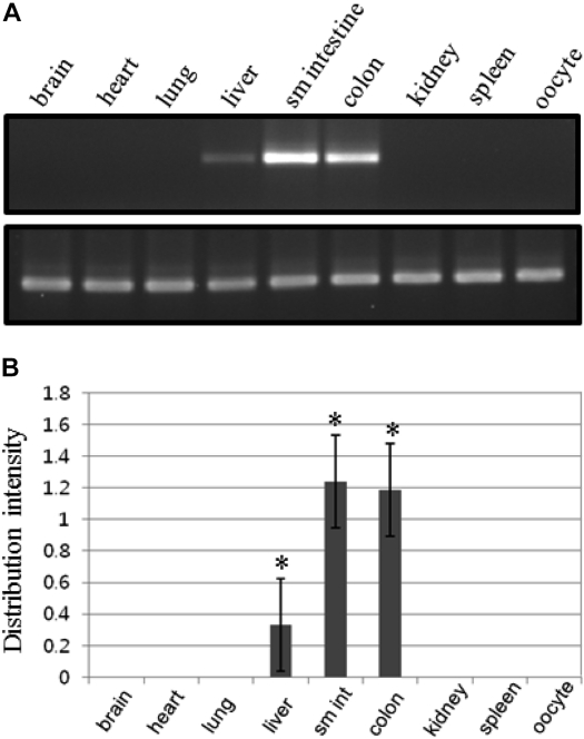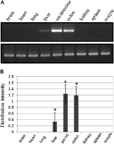 Figure 4. CMP6 quantification by real-time PCR. Relative quantification is shown as a bar graph. The relative CMP6 expression ratios for β-actin are shown. This result confirms the idea of CMP6 being largely expressed in liver, small intestine (sm int), and colon. The graph represents three independent experiments with each bar as mean±SD. *P<0.05 compared to control group.