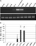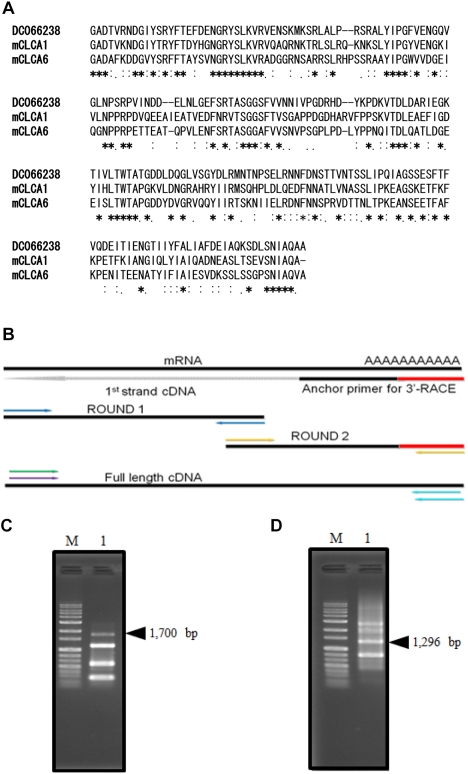 Figure 1. CMP6 cDNA isolation. (A) Sequence alignment of DC066238. Amino acid (aa) alignment was deduced by querying the DC066238 amino acid sequence using GENETYX. The amino acid homology is indicated as follows: identical (asterisk), very similar (double dot) and similar (dot). (B) The strategy is shown for generating full-length cDNA. First strand cDNA (dotted) and PCR products (thick) are shown with black lines. CMP6: 5'-RACE and 3'-RACE products represent Round 1 and Round 2, respectively. 3'-RACE products are shown in panel (C) lane 1, and 5'-RACE PCR products in (D) lane 1. PCR products were electrophoresed in a 1% agarose gel. Black arrowheads on panels (C) and (D) indicate the 1,700 and 1,296 bp of target products of CMP6. Molecular weights are shown for 1 kb Plus size markers (G&P, Anyang, Korea).