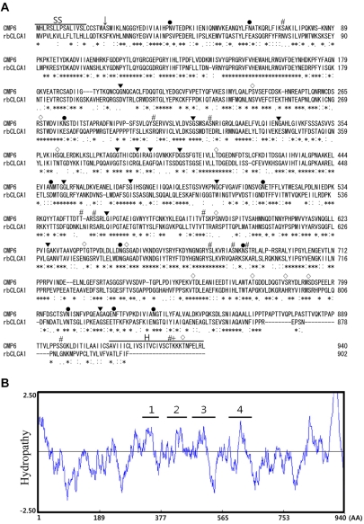 Figure 2. Comparison of X. laevis CMP6 primary structure. (A) CMP6 amino acids were aligned by querying with rat CLCAs on CLUSTAL W. The homology of amino acids of CMP6 is indicated as identical (asterisk) very similar (double dot) and similar (dot). Consensus sites are marked as follows: N-linked glycosylation (●), N-myristoylation sites (▾), phosphorylation by PKC (#), by casein kinase II (◇) and by cAMP-dependent protein kinase (+). The predicted signal sequence (SS) and the hydrophobic carboxyl terminus (H) are overlined. An arrow indicates the predicted cleavage site. (B) Hydropathy analysis. The hydropathy plot was analyzed by the Kyte-Doolittle method. Hydrophobic domains are given as positive values. The proposed hydrophobic domains are four segments.