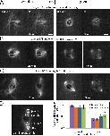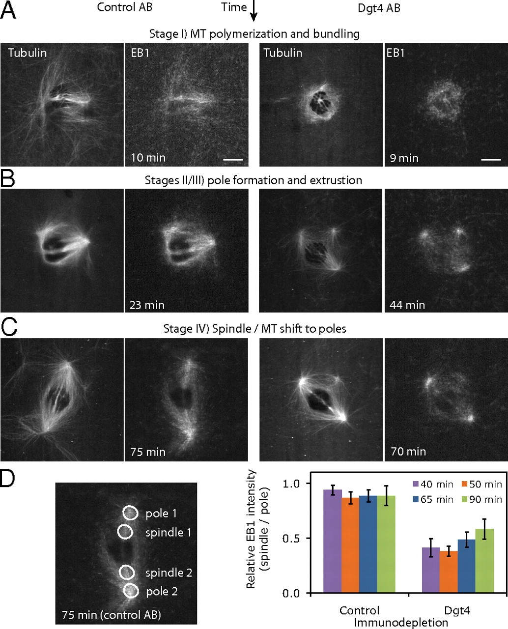 Fig. 4. Visualization of growing MT plus ends via GFP-EB1 in extracts with control antibody (Left) or anti-Dgt4 antibody (Right). (A) Representative images of tubulin (Cy3-channel) and GFPâEB1 (140 nM) are shown for extract incubated with control or Dgt4 antibody (see Fig. 3G and Fig. S3 CâE) at three assembly stages (see Fig. 1D). (B and C) Augmin-inhibited spindles show a reduction of EB1âGFP comets from the middle of the spindles. Note the prominent density of EB1âGFP comets at the acentrosomal poles in C (both control and Dgt4 AB). (Scale bars, 10 μm.) See also Movie S3 (control AB) and Movie S4 (Dgt4 AB). (D) Quantitation of the ratio between the EB1 intensity in the midzone and near the poles (see circles for zone of measurement). Mean and SEM are derived from three independent experiments (2â7 spindles measured for each time point in each independent experiment).