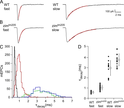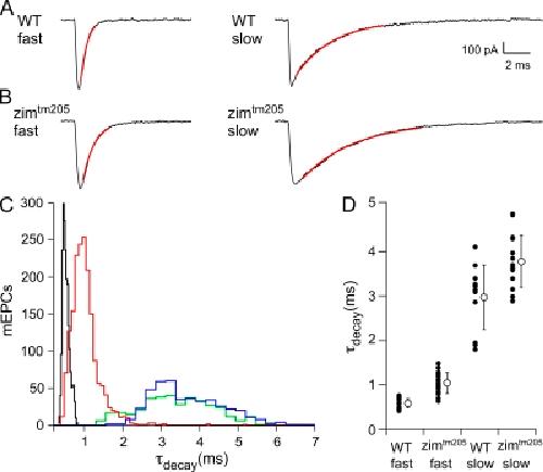 Figure 1. Comparison of decay time constants (τdecay) of spontaneous synaptic currents (mEPCs) between wild-type and acetylcholinesterase-null (zimtm205) 72–82-hpf larval zebrafish. (A) Sample mEPCs from wild-type fast (left) and wild-type slow (right) skeletal muscle. The 10–90% decay phase is fit to a single-exponential function (red) to obtain τdecay. (B) Sample mEPCs from zimtm205 fast (left) and zimtm205 slow (right) skeletal muscle, each fit in the same manner as those in A. (C) The frequency histogram of τdecay values for individual mEPCs from wild-type fast muscle (black; n = 14 recordings), zimtm205 fast muscle (red; n = 28 recordings), wild-type slow muscle (green; n = 15 recordings), and zimtm205 slow muscle (blue; n = 15 recordings). (D) The mean τdecay values for each recording (filled circles) along with the overall mean ± SD (open circle) are shown for each condition.