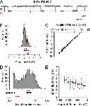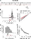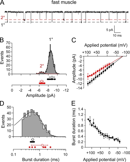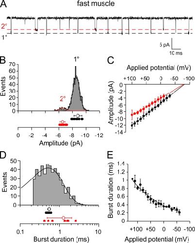 Figure 2. Single-channel ACh-activated currents from fast skeletal muscle of 72-hpf larval zebrafish. (A) A sample ∼0.25-s trace showing two amplitude classes of ACh-activated channels (300 nM) recorded from a cell-attached patch at +30 mV applied potential. The open channel levels for the primary (1°) and secondary (2°) amplitude classes are indicated by the dashed lines. (B) The amplitude frequency histogram for openings recorded from a single patch at +50 mV applied potential. The mean value for each recording (filled symbols) is shown below the sample histogram for both the 1° and 2° classes, along with overall mean values ± SD (open circles). (C) The current–voltage relations for the 1° (black) and 2° (red) single-channel amplitude classes. Each symbol represents the mean amplitude ± SD values of all patches (n = 12) for each applied potential. (D) A burst-duration frequency histogram for the 1° amplitude class from a single recording fit with an exponential function. The mean burst-duration values for each recording of the 1° class (black filled symbols) and 2° class (red filled symbols) are shown along with the overall mean ± SD (open circles) below the histogram. (E) The relationship between applied potential and mean burst duration of the 1° amplitude class is exponential and corresponds to an e-fold change per 122 mV. Each symbol represents the mean ± SD (n = 8 recordings).