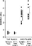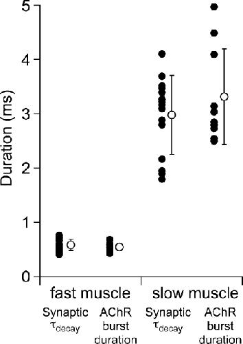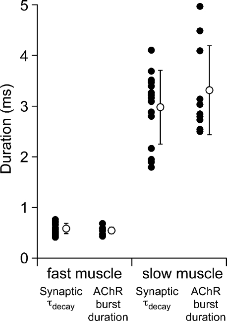 Figure 3. Comparison of single-channel mean burst duration and τdecay of synaptic current for fast and slow muscle recordings. The mean values for individual recordings are indicated by filled symbols, and the overall mean ± SD is indicated as the open symbol for each condition.