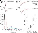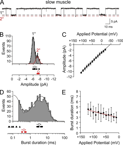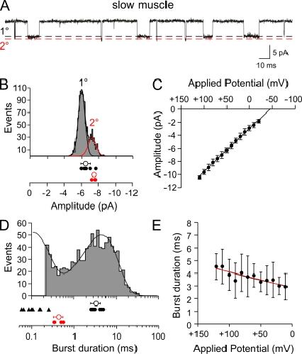 Figure 4. Single-channel ACh-activated currents from slow skeletal muscle of 72-hpf larval zebrafish. (A) A sample ∼0.25-s trace showing two amplitude classes of ACh-activated channels (300 nM) recorded from a cell-attached patch at +50 mV applied potential. The open channel levels for the primary (1°) and secondary (2°) amplitude classes are indicated by the dashed lines. (B) The amplitude frequency histogram for a single recording with two amplitude classes (1° and 2°) at +50 mV applied potential. The mean values for each class are indicated for individual recordings (filled symbols) along the overall mean ± SD (open symbols) below the histogram. (C) The current–voltage relations for the pooled 1° openings. Each symbol represents the mean amplitude ± SD values of all patches (n = 8) for each applied potential. (D) A burst-duration frequency histogram from a single recording fit to the sum of two exponential functions. Only the 1° amplitude class was included in the distribution. The mean values for the brief (filled triangles) and long (filled circles) mean burst duration for the 1° class are indicated along with the overall mean ± SD (open symbols). The 2° class was fit separately to a single exponential (not depicted), and the individual mean values for burst duration for each recording (red filled circles) are indicated along with the overall mean ± SD (red open symbol). (E) The relationship between applied potential and mean burst duration is shown for all 1° class openings fit with linear (black) and exponential (red) curves. Each symbol represents the mean ± SD (n = 10 recordings).
