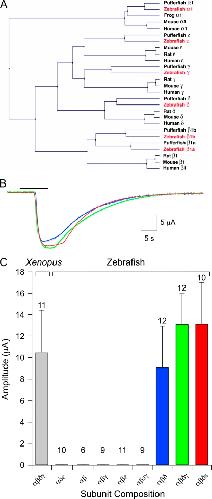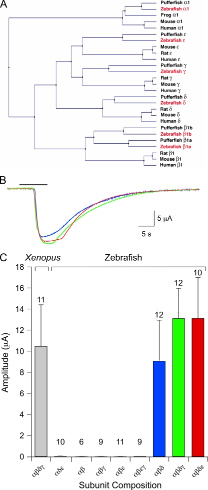 Figure 5. Zebrafish AChR subunit identification and functional expression in Xenopus oocytes. (A) A phylogenetic tree of AChR subunit genes constructed by the UPGMA method. Subunit sequences of human (Homo sapiens), mouse (Mus musculus), rat (Rattus norvegicus), puffer fish (Takifugu rubripes), and frog (Xenopus tropicalis) are included. Zebrafish genes are highlighted in red. (B) Two microelectrode recordings of membrane currents elicited by 30 µM ACh (bar) at a −80 mV holding potential. Shown are responses from oocytes expressing αβδε (red trace), αβδγ (green trace), or αβδ (blue trace) RNA. (C) The mean ± SD macroscopic current amplitude associated with the RNA subunit combinations is indicated. Xenopus αβδγ RNA is shown for comparison, and the number of oocytes tested is indicated for each RNA combination tested. The three combinations that yielded currents suitable for single-channel recordings are indicated by colored bars.