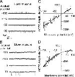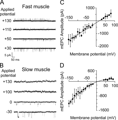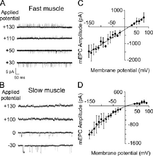 Figure 8. Differences in rectification between fast and slow muscle ACh-activated single-channel currents. Sample single-channel traces at holding potentials that are either positive or negative to the current reversal potential (∼0 mV) for fast muscle (A) and slow muscle (B). (C) The current–voltage relations for fast muscle synaptic currents, with each point representing the mean ± SD of seven recordings, fit by a linear curve. (D) The current–voltage relations for synaptic currents in slow muscle, with each point representing the mean ± SD for 10 recordings, fit by a second-order polynomial curve.