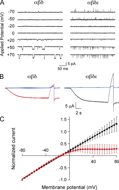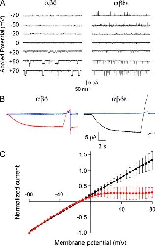 Figure 9. Inward rectification of the zebrafish αβδ channel isoform. (A) Sample ACh-activated single-channel currents recorded at the indicated potentials from cell-attached patches of Xenopus oocytes injected with either αβδ (left) or αβδε (right) RNA. (B) Whole oocyte ACh-activated macroscopic currents recorded at −80 mV and subsequently ramped from −80 to +80 mV over a 2-s period. Oocytes were either injected with αβδ (red) or αβδε (black). Leak currents recorded before ACh application are indicated in blue. (C) Current–voltage relations of macroscopic currents from αβδ (red; n = 5) and αβδε (black; n = 3) RNA-injected oocytes were normalized to peak current and fit with fifth-order polynomial (red) or linear curves (black).