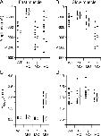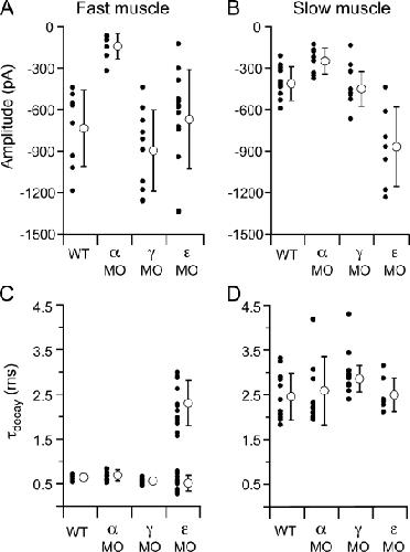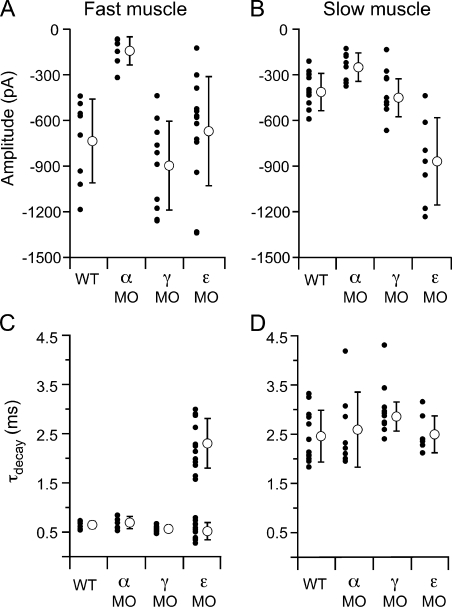 Figure 10. Comparison of synaptic current properties after α, γ, and ε AChR subunit knockdown in fast and slow muscle. All recordings were performed at a −70 mV holding potential. (A) Mean amplitude of spontaneous synaptic currents recorded from fast muscle for individual cells (filled circles) and overall mean ± SD (open circles) for each condition. (B) Mean amplitude of spontaneous synaptic currents recorded from slow muscle for individual cells (filled circles) and overall mean ± SD (open circles) for each condition. (C) Mean τdecay values for individual fast muscle recordings (filled circles) and overall mean ± SD (open circles) for each condition. (D) Mean τdecay values for individual slow muscle recordings (filled circles) and overall mean ± SD (open circles) for each condition.