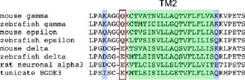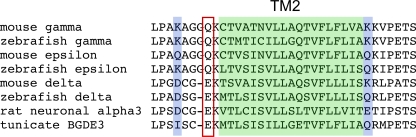 Figure 11. Alignment of residues within AChR subunits of different species. The residues outlined with red form the intermediate charged ring and have been shown to be involved in channel rectification of rat neuronal α3 and tunicate BDGE3 subunit–containing receptors. The second transmembrane region (TM2) is indicated by the shaded green, and the outer and inner charged rings are indicated by the blue shade.