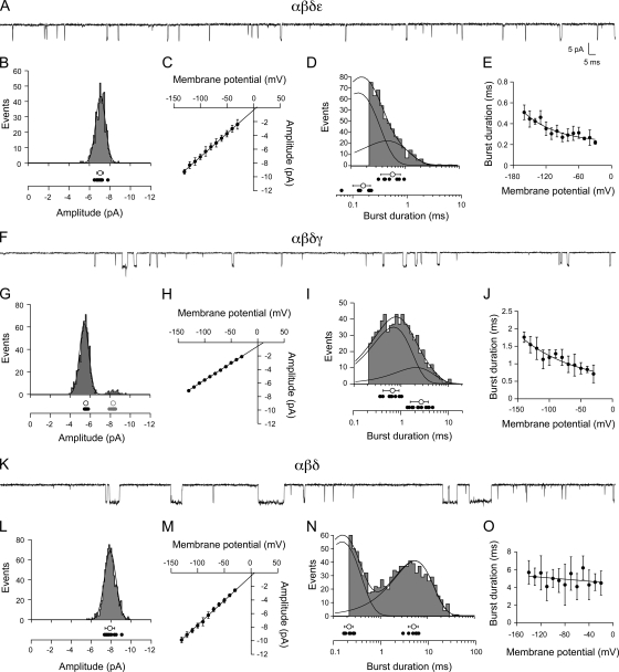 Figure 6. Functional properties of ACh-activated single-channel currents from Xenopus oocytes expressing αβδε (A–E), αβδγ (F–J), and αβδ (K–O) subunit RNA. (A) Sample recording from a patch expressing αβδε at −100 mV. (B) A representative amplitude histogram for one recording, with individual mean values for all recordings (filled circles; n = 12) shown below along with the overall mean ± SD (open circle) at −100 mV. (C) The cumulative current–voltage relations for eight recordings. (D) A representative burst-duration histogram fit by the sum of two exponentials. The time constants for each exponential are indicated for each recording (filled circles; n = 7) along with the overall mean ± SD for all recordings (open circles) at −100 mV. (E) The relationship between burst duration and membrane potential for seven recordings fit to an exponential function. The voltage dependence corresponds to e-fold change per 156 mV over this range. (F) Sample recording from a patch expressing αβδγ at −100 mV. (G) A representative amplitude histogram from one recording showing a 1° (black) and 2° (red) amplitude class of openings. The individual mean values for 10 recordings (filled circles) are shown along with the overall mean ± SD (open circles) for each class at −100 mV. (H) The cumulative current–voltage relations for the primary class for eight recordings. (I) A representative burst-duration histogram fit by the sum of two exponentials. The time constants for each exponential are indicated for each recording (filled circles; n = 9) as well as the overall mean ± SD (open circles) at −100 mV. (J) The relationship between burst duration and membrane potential for four recordings fit to an exponential function. The voltage dependence corresponds to e-fold change per 141 mV over this range. (K) Sample recording from a patch expressing αβδ at −100 mV. (L) A representative amplitude frequency histogram from a single recording with the individual mean values for all recordings (filled circles; n = 13) along with the overall mean ± SD (open circle) at −100 mV. (M) The cumulative current–voltage relations for 11 recordings. (N) A representative burst-duration histogram fit by the sum of two exponentials. The individual time constants for each exponential are indicated for each recording (filled circles; n = 6) as well as the overall mean ± SD for all recordings (open circles) at −100 mV. (O) The relationship between burst duration and membrane potential for six recordings fit to an exponential function over the range of values shown yielding an e-fold change in burst duration per 769 mV.