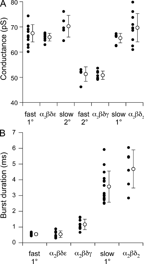 Figure 7. Comparisons between fast and slow muscle ACh-activated channels and individually identified receptor isoforms expressed in Xenopus oocytes. (A) Comparisons of single-channel conductance for α2βδε, α2βδγ, and α2βδ2 receptor isoforms in oocytes to both the 1° and 2° amplitude classes from muscle. The values from individual recordings (filled circles) and overall mean ± SD values (open circles) are indicated for each condition. (B) Comparisons of single-channel mean burst duration of α2βδε, α2βδγ, and α2βδ2 receptor isoforms to the mean burst duration of 1° fast and slow muscle receptors. The values from individual recordings are indicated by filled circles, and the overall mean ± SD values are indicated by the open circle for each condition.