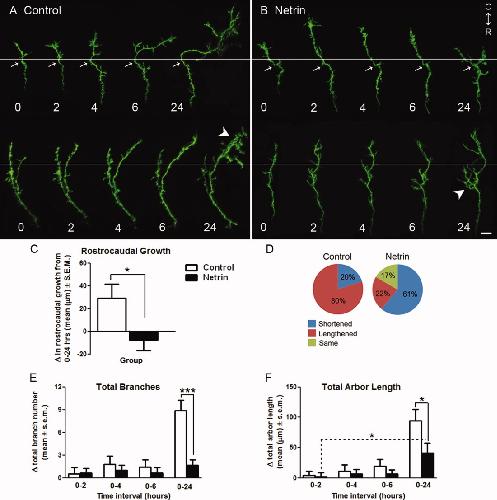 Figure 1 Netrin influences the forward advancement and morphology of RGC axon growth cones at their target. (A, B) Representative reconstructions of control (A), and netrinâtreated (B), RGC axon growth cones in stage 40 tadpoles expressing EYFP imaged by timeâlapse confocal microscopy over 24 h. White horizontal lines delineate the forwardâback branching boundary used for quantification of axon growth [also see diagram in Fig. 2(A)]. White arrows indicate examples of intrinsic landmarks (bends in the axon) common to all time points that were used to align images. White arrowheads demarcate differences in the branching patterns of growth cones exposed to control vehicle solution or recombinant netrin (see Fig. 2). Illustrated portions of the axons lie completely within the optic tectum, and rostral to caudal (RâC) orientation of the brain is indicated. Scale bar, 10 μm. (C, D) A measure of rostroâcaudal growth is provided by the change in length of axons exposed to control or netrin treatment over a 24 h period (C), as well as the proportion of axons that lengthened, shortened or remained the same length throughout the observation period (D). Note that while the majority axons in control tadpoles lengthened, axons exposed to netrinâ1 shortened over time or remained the same length. (E, F) The effects of netrinâ1 treatment on RGC axon growth cones of Stage 40 tadpoles were further determined by quantifying the changes in total branch number (E), and total arbor length (F), at each time point relative to time 0. While changes in total branch number and length were similar for axons in control and netrinâtreated tadpoles during the first 6 h of imaging, a delayed effect of netrin is observed on branch number and length by 24 h. Dotted lines indicate within group comparisons; solid lines represent between group comparisons. * signifies p < 0.05, ***p < 0.0005. Error bars indicate SEM. |