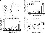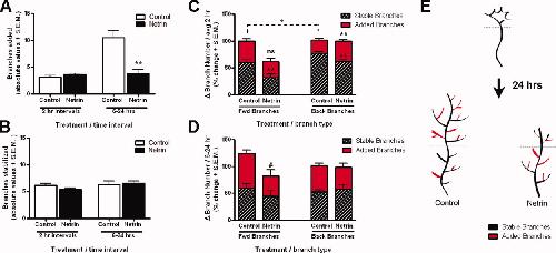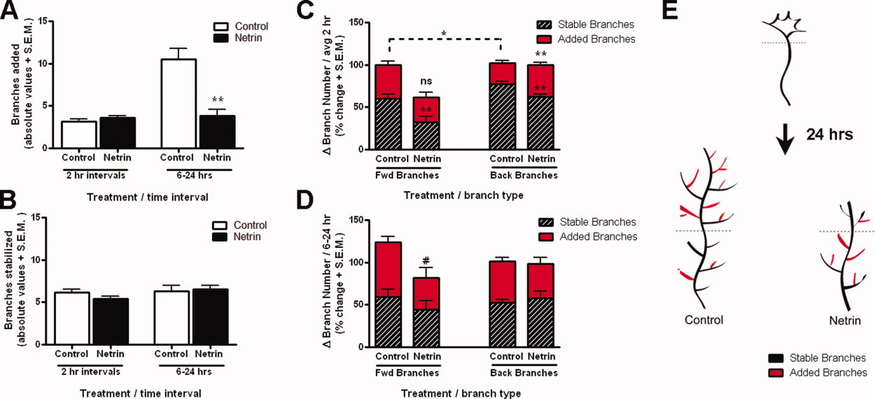 Figure 3 Netrin influences the dynamic branching behavior of recently targeted RGC axons. (A, B) The dynamic behavior of recently targeted RGC axon growth cones in Stage 40 tadpoles is illustrated by the quantification of total branch addition and branch stabilization for every 2âh interval during the first 6 h after treatment (average 2 h interval), and between 6 and 24 h. (A) Note that the number of new branches added was similar for newly targeted RGC axons exposed to netrinâ1 as for controls during the first 6 h after treatment but was significantly decreased later in the observation period. (B) Analysis of stable branch number reveals that the number of stable branches was similar for control RGC axons and for those exposed to netrinâ1 at all time intervals. (C, D) The relationship between branch addition and stabilization of forward versus back branches was measured for each individual axon and is illustrated by the stacked bar graphs. (C) In proportion, more new forward branches than back branches were added in control axons during every 2 h observation interval, while a similar number of forward versus back branches were added in axons in netrinâtreated tadpoles. Note that, in proportion, significantly more new back branches were added in axons exposed to netrinâ1 than in controls. (D) No significant difference in the proportion of added and stable forward versus back branches was observed between 6 and 24 h after initial imaging for controls or axons exposed to netrinâ1. In (C, D), stacked bars with a value above 100% represent intervals when more of the newly added branches were stabilized than eliminated. Conversely, stacked bars with a total value of less than 100% represent axons where in proportion more branches were eliminated than added at each corresponding time interval. # signifies 0.05 < p < 0.10; *p < 0.05; **p < 0.005, and *** p < 0.0005, ns = nonsignificant versus control. A dashed line represents comparisons within treatment group. Error bars indicate SEM. (E) Diagrammatic representation of the differential branch addition and stabilization in differentiating RGC axon growth cones in control tadpoles versus tadpoles exposed to netrin 24 h after treatment. |