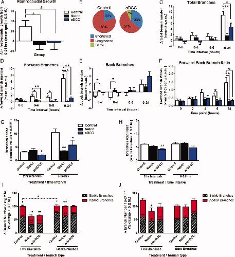 Figure 5 DCC receptor blockade interferes with RGC axon growth cone branching in Stage 40 tadpoles. (A, B) The effects of acute antiâDCC treatment on simple RGC axons of Stage 40 tadpoles 24 h after treatment on rostrocaudal growth is illustrated by the average change in axon length from its initial position at time 0 (A), and by the relative proportion of RGC axons that shortened, lengthened or remained the same length (B). (CâE) The effects of DCC receptor blockade on the branching of RGC axon growth cones is shown by the quantification of the change in total branch number (C), and the change in forward (D) versus back (E), branches from the initial observation period to the next. Note that antiâDCC treatment interfered with axon branching when compared to controls (D), an effect that was significant on forward branches (D), but not on back branches (E). (F) Axons exposed to antiâDCC treatment had a forwardâback branch ratio that differed significantly from that of controls by 24 h. (GâJ) The effects of antiâDCC treatment on branch dynamics of RGC growth cones is illustrated by the total number of branches added (G) and stabilized (H), and by the proportion of added and stable forward versus back branches (I, J) during every 2 h observation interval and between 6 and 24 h. Note that in contrast to control and netrinâ1 treatment, antiâDCC treatment decreased both the addition and stabilization of branches. However in proportion, dynamic changes in branch addition of forward versus back branches were similar to control. *p < 0.05, **p < 0.005, and *** p < 0.0005. Error bars indicate SEM. [Color figure can be viewed in the online issue, which is available at wileyonlinelibrary.com.] |