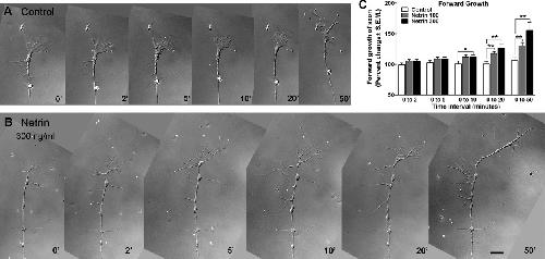 Figure 6 In culture, RGC axon growth cones respond to acute netrin treatment with increased forward growth. (A, B) Timeâlapse sequence of sample RGC axon growth cones imaged in culture under control conditions (A) and following acute exposure to netrinâ1 (B). Scale bar, 10 μm. (C) The increase in forward advancement of the growth cone from time 0 to subsequent observation intervals is shown by the relative increase in length for each individual axon (time 0 equals 100%). Note that treatment with netrin significantly increased the forward advancement of RGC growth cones in culture 10 min after treatment, in a doseâdependent manner. |
