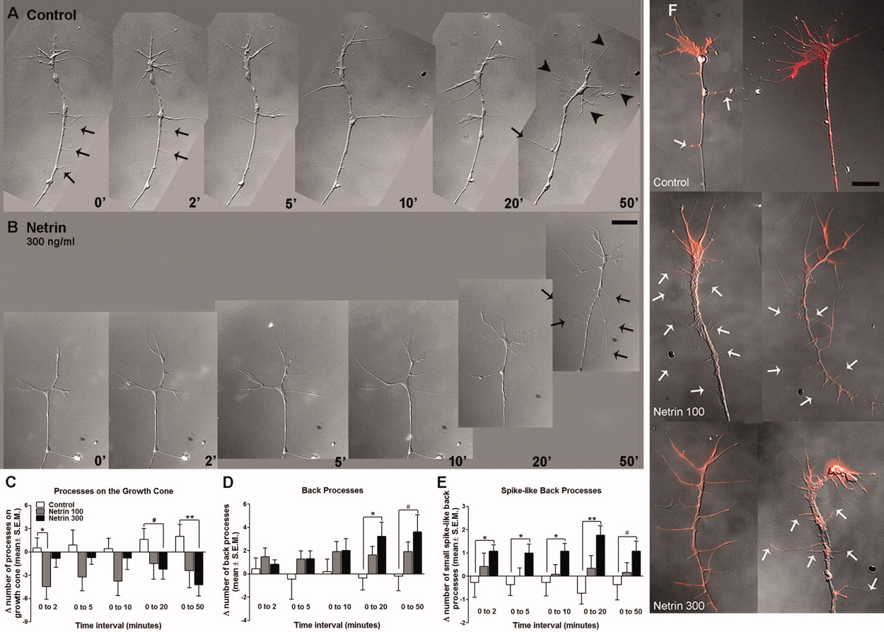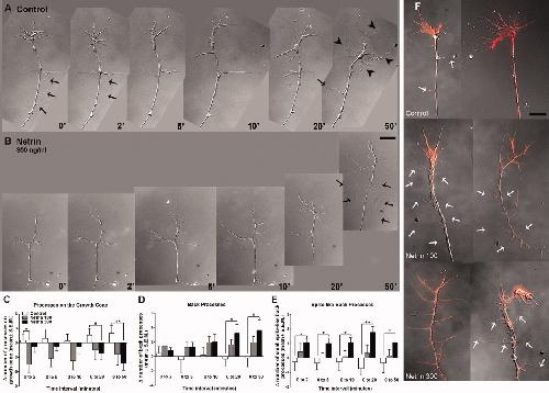 Figure 8 Netrinâ1 induces extension of filopodial processes behind the growth cone in RGC axons in culture. (A, B) Timeâlapse sequence of sample RGC axon growth cones imaged in culture under control conditions (A) and following acute exposure to netrinâ1 (B). Black arrowheads point to filopodial processes at the growth cone in (A), and arrows point to processes behind the growth cone in (A) and (B). These representative timeâlapse images illustrate differences in the extension of filopodial processes in control and netrinâtreated (300 ng/mL) growth cones. Scale bar, 10 μm. (C) Quantitation of changes in number of filopodial processes at the growth cone show that netrin treatment results in growth cones with fewer growth cone processes than controls. (D, E) The number of processes behind the growth cone, along the axon shaft (D; back processes), as well as the number of short, spikeâlike processes (less than 1.5 μm; (E) behind the growth cone are increased after netrin treatment. (F) Representative growth cones in fixed cultures 1 h postâtreatment, stained with rhodamine phalloidin (red), illustrate the decrease in the number of filopodial processes on the growth cone in RGC axons in cultures exposed to netrin. White arrows indicate back processes. Scale bar, 10 μm. *p < 0.05, and **p < 0.005. Error bars indicate SEM. [Color figure can be viewed in the online issue, which is available at wileyonlinelibrary.com.] |