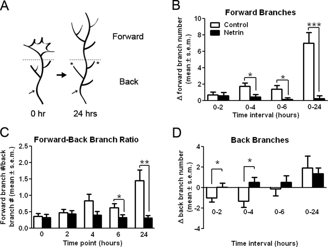 Figure 2 Netrinâ1 differentially influences forward versus back branching of simple RGC axons in Stage 40 tadpoles. (A) Diagrammatic representation of the method used to differentiate forward versus back branching. A horizontal dotted line was used to delineate the forwardâtoâback branch boundary on RGC growth cones imaged over time. Asterisks are used to denote stable branches which persisted throughout the observation period; these stable branches, along with distinctive bends and swells in the axon (black arrows), were used as landmarks for image alignment along the forwardâback branch boundary line. (B, D) The difference in the number of total forward (B), or back (D), branches in RGC axons imaged over time was quantified for EYFPâexpressing axons in control Stage 40 tadpoles and in tadpoles injected with netrinâ1 immediately after the initial imaging (time 0). Note the significant effect of netrin treatment on the number of both forward and back branches on RGC axon growth cones 4 h after treatment. Netrin transiently and significantly increased the proportion of back branches between 0 and 4 h relative to controls (D), but prevented the increase in forward branches observed in controls (B). (C) A forwardâtoâback branch ratio provides an additional measure of axon growth. As RGC axon growth cones branched in the optic tectum, they extended a greater portion of forward than back branches, as indicated by a mean forwardâtoâback branch ratio greater than 1. A forwardâtoâback branch ratio of less than 1 as time proceeds is indicative of decreased forward growth relative to the degree of back branching. Solid lines represent betweenâgroup comparisons. *p < 0.05; **p < 0.005, and ***p < 0.0005. Error bars indicate SEM. |