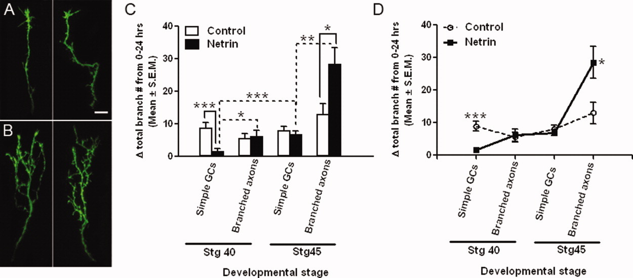 Figure 4 The age and morphological state of the RGC axon affect its branching response to netrinâ1 in vivo. (A, B) Representative images of two distinct RGC axon growth cones (A), and two branched RGC axons (B), in Stage 40 tadpoles at time 0. RGC axon growth cones and branched axons of Stage 45 tadpoles possessed morphologies similar those of Stage 40 tadpoles (not shown). Scale bar, 10 μm. (C, D) The difference in branching rates of RGC axon growth cones (Simple GCs) and branched arbors (Branched axons) of Stage 40 versus Stage 45 tadpoles in controlâtreated and netrinâtreated tadpoles is shown graphically by the increase in total branch number over 24 h. C) The increase in branch number (delta total branch number) over a 24 h period is not significantly different for RGC axons in control tadpoles at the two developmental stages examined (Stage 40 and Stage 45), or for RGC axons with simpler or more complex arbors (simple growth cones or branched axons). Note the differential effect of netrin on simple growth cones of Stage 40 tadpoles, and on branched RGC axons of Stage 45 tadpoles, when compared to ageâ and morphologyâmatched controls. (D) The difference in the branching rates of RGC axons exposed to netrin is better illustrated by the line graph of data shown in (C). Data on branched RGC axons of Stage 45 tadpoles is as published in Manitt et al., 2009. Dotted lines indicate within group comparisons; solid lines represent between group comparisons. * signifies p < 0.05; **p < 0.005, and *** p < 0.0005. Error bars indicate SEM. [Color figure can be viewed in the online issue, which is available at wileyonlinelibrary.com.] |