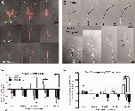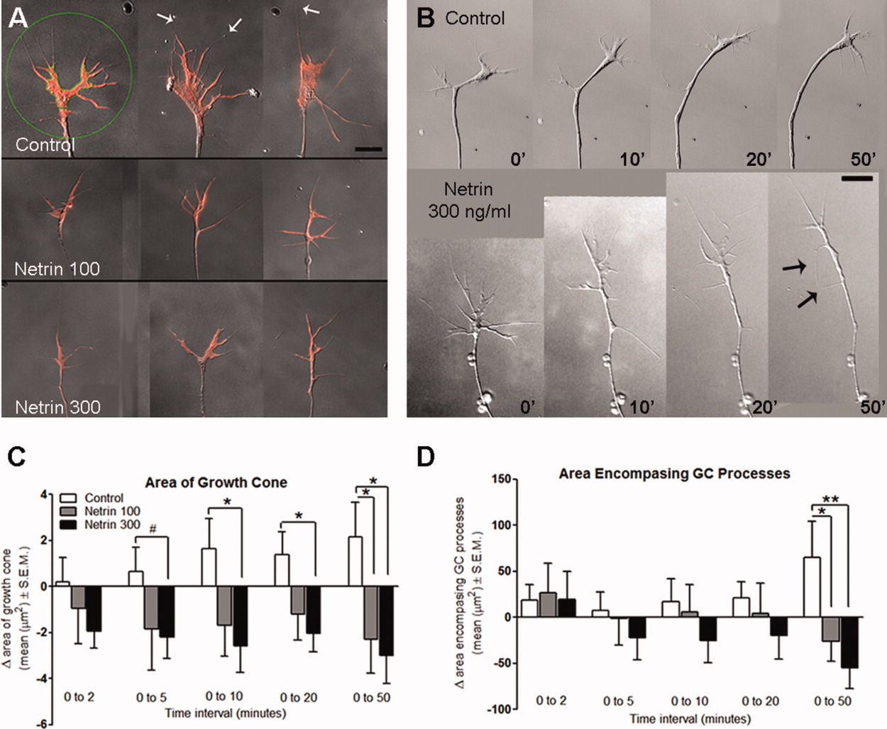 Figure 7 Dynamic growth cone changes in RGC axons in response to netrin treatment. (A) Representative images from growth cones in culture fixed 1 h postâtreatment, stained with rhodamine phalloidin (red), serve to illustrate the changes in growth cone morphology in response to netrin treatment. The green circle and the green line around the lamellipodial perimeter in the first sample serve to illustrate the areas selected for measurement of lamellipodial area, and area encompassing the growth cone processes, respectively. White arrows indicate filopodial processes in growth cones. (B) Dynamic changes in RGC axon growth cone morphology following netrin treatment are illustrated by this example (time 0). Black arrows point to processes newly extended by the growing axon (see also Fig 8). Scale bar for (A) and (B), 10 μm. (C) Measurements of the lamellipodial area of the growth cone show that within five minutes of netrin treatment the area of the growth cone decreases in size, a behavior that is different from controls. (D) Measurement of the area encompassing the filopodial processes on the growth cone show that netrin treatment gradually decreased the radial spread of the growth cone processes, an effect that became significantly different from controls 50 min postâtreatment. * p < 0.05; **p < 0.005. Error bars indicate SEM. |