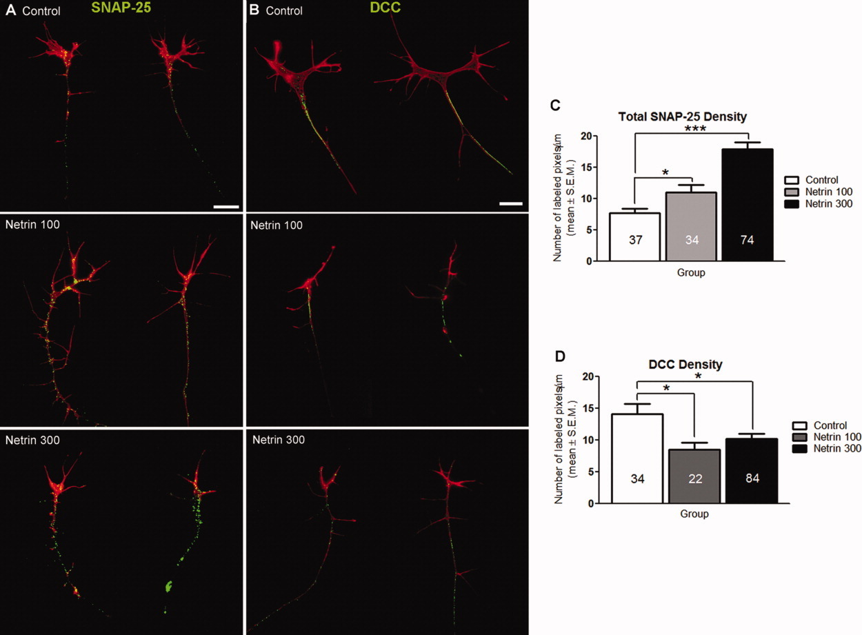 Figure 9 Acute exposure to netrinâ1 influences presynaptic protein density and DCC expression in RGC axons in culture. (A, B) Representative control and netrinâtreated RGC growth cones in culture immunostained with antibodies to SNAPâ25 (A, presynaptic protein marker) or antibodies to the netrin receptor DCC (B). Retinal explant cultures were grown in culture for 24 h then treated with netrinâ1(100 ng/mL or 300 ng/mL) or vehicle solution for 1 h before fixation and immunostaining. Cultures were also stained with rhodamine phalloidin (red) before antibody staining to visualize the actin cytoskeleton. (A) SNAPâ25 immunoreactivity is observed throughout the axon shaft and at the growth cone in axons in control and netrinâtreated cultures. Note that SNAPâ25 immunoreactivity is increased by the netrinâ1 treatment. Scale bar, 10 μm. (B) DCC immunoreactivity is observed primarily along the axon, and is absent from growth cones in control and netrinâtreated cultures. Dense DCC immunostaining was observed in axons of control cultures but was reduced in axons from cultures treated with netrinâ1 at the two concentrations used. Scale bar, 10 μm. (C) The density SNAPâ25 immunostaining was quantified by counting the number of immunoreactive pixels per total axon length (μm). A doseâdependent increase in the density of SNAPâ25 immunostaining is observed in growth cones following netrinâ1 treatment. (D) Quantification of the density of DCC immunostaining along the axon showed that DCC levels decrease following exposure to netrinâ1. Sample sizes are indicated by the numerical values inside bars. * signifies p < 0.05 and ***p < 0.0005. Error bars indicate SEM. |