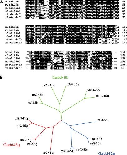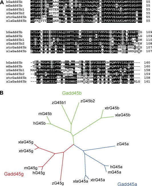 Fig. 1. Sequence comparison of Gadd45 genes. (A) Multiple alignment of predicted full-length amino acid sequences of Gadd45b from X. laevis (xla), X. tropicalis (xtr), human (h), mouse (m) and zebrafish (z). Conserved residues in at least five sequences or in at least three sequences are highlighted in black and gray, respectively. (B) Phylogenetic tree of vertebrate Gadd45a, Gadd45b and Gadd45g genes based on the average distance using % identity (ClustalW)