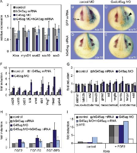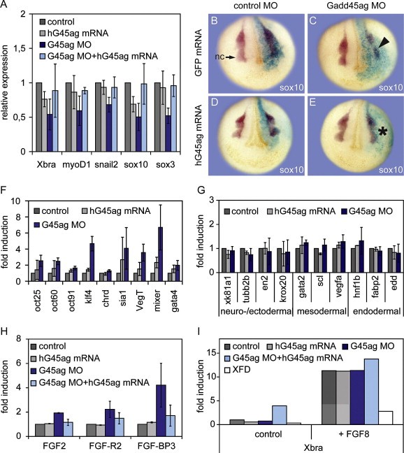Fig. 5. Gadd45a and Gadd45g act redundantly to inhibit pluripotency and promote cell differentiation. (A) qPCR expression analysis of neurula (stage 18) embryos injected with the indicated agents analyzing early expressed developmental genes which are repressed by Gadd45ag MO and rescued by hGadd45ag mRNA coinjection. (BâE) sox10 expression in neurula embryos (stage 18, anterior view) unilaterally injected with the indicated combinations of mRNA (left) and MO (top) and lineage tracer (blue β-gal staining). Note reduced sox10 expression in neural crest (nc) after Gadd45ag MO injection (arrowhead in B). Coinjection of hGadd45a and hGadd45g mRNA rescues this repression (asterisk in D). (FâH) qPCR expression analyses of the indicated genes at neurula stage (st. 18) injected with hGadd45ag mRNA and Gadd45ag MO. (F) Pluripotency- and early germ layer specific markers upregulated by Gadd45ag MO. (G) Terminal differentiation markers unaffected by Gadd45ag overexpression or knock down. (H) FGF related genes upregulated by Gadd45ag MO. (I) qPCR expression analysis of Xbra in stage 11 animal caps after induction with FGF8 mRNA, coinjected with the indicated agents (see Section 4). Key: (G45) Gadd45, XFD (dominant negative FGF receptor).