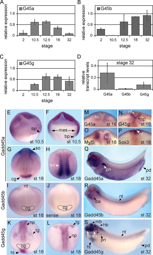 Fig. 2. Differential expression of Gadd45a, Gadd45b and Gadd45g during Xenopus embryogenesis. (AâC) qPCR analyses showing the mean concentration normalized to GAPDH of Xenopus Gadd45a (A), Gadd45b (B) and Gadd45g (C). (D) Quantification of relative transcript levels of Xenopus Gadd45a, Gadd45b and Gadd45g in tadpole stage (st. 32) embryos. (EâS) Whole mount in situ hybridization expression analyses. (EâH) Gadd45a expression in lateral view of whole (E) and sagitally halved (F) gastrula stage (st. 10.5) embryos, dorsal is right. (G) Anterior and (H) dorsal view of late neurula stage (st. 18) embryo. (I and J) Gadd45b expression in anterior view of stage 18 embryo using antisense (I) and sense control probe (J). (K and L) Gadd45g expression in anterior view (K) and dorsal view (L) of stage 18 embryo. (MâP) Expression analysis of stage 18 embryos cut transversally with the probes indicated. (QâS) Lateral view of tadpole stage (st. 32) embryos hybridized with probes for Gadd45a (Q), Gadd45b (R) and Gadd45g (S). The cement glands are outlined by dashed lines in (IâK). Key: (ba) branchial arches, (bp) blastopore, (cg) cement gland, (ey) eye, (fb) forebrain, (hb) hindbrain, (ht) heart field, (mes) mesoderm, (mb) midbrain, (nf) neural fold, (np) primary neuron precursors, (nt) neural tube, (pd) proctodeum, (pn) pronephros, (so) somites, (tg) trigeminal placode.
