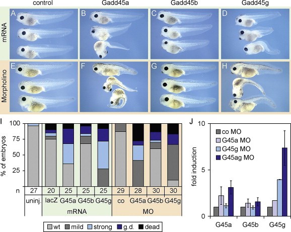 Fig. 3. Gadd45a, Gadd45b and Gadd45g overexpression and knock down in Xenopus embryos cause pleiotropic phenotypes. (AâH) Phenotypes of stage 41 embryos resulting from Gadd45 mRNA injection (AâD) or antisense MO knock down (EâH). The topmost tadpoles represent the least affected specimen of the respective group, the lower two show the representative phenotypes. Embryos were injected with 5 ng of lacZ (A), Gadd45a (B), Gadd45b (C) or 1 ng of Gadd45g (D) mRNA, or the respective MO (EâH), as described in Section 4. (I) Quantification of the phenotypes shown in AâH caused by Gadd45 overexpression or knock down. (J) qPCR analysis of Gadd45 expression in neurulae (stage 18) injected with Gadd45 single or double MOs as described in Section 4. Key: (co) Control, (G45) Gadd45, (g.d.) gastrulation defect, (wt) wild type.