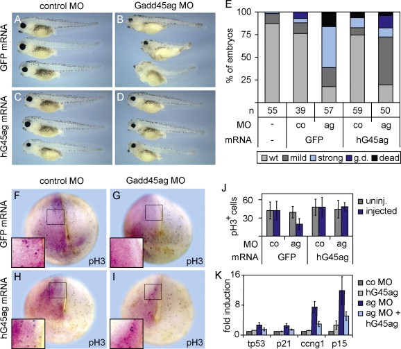 Fig. 4. Gadd45aâGadd45g double knock down is rescued by hGadd45a and hGadd45g mRNAs. (AâD) Phenotypes of stage 41 embryos coinjected with the indicated combinations of mRNA (left) and Morpholinos (MO, top). (E) Quantification of the phenotypes shown in AâD. (FâI) Phospho-Histone 3 immunostaining (blue nuclei) of neurula embryos (anterior view) injected unilaterally with lineage tracer (red β-gal staining) with the indicated combinations of mRNA (left) and MO (top). Insets, enlarged boxed areas. (J) Quantification of p-Histone 3 positive cells on injected and uninjected sides. Data represent the mean ± SD of 16 embryos per sample. (K) Cell cycle inhibitor qPCR expression analysis in double Gadd45ag Morphant neurulae and rescue by mRNA coinjection. Key: (ag) Gadd45a MO + Gadd45g MO, (co) control MO, (G45) Gadd45, (g.d.) gastrulation defect, (hG45ag) hGadd45a + hGadd45g mRNA, (pH3+) p-Histone 3 positive, (wt) wild type.