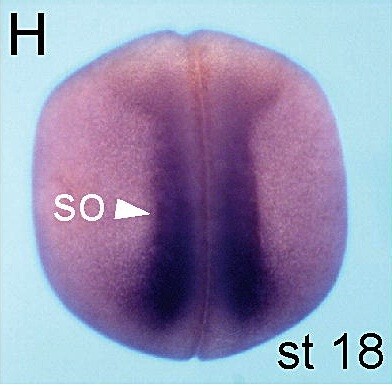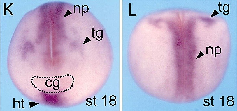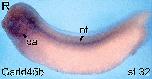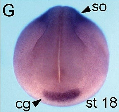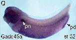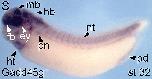 gadd45g (growth arrest and DNA-damage-inducible, alpha) gene expression in Xenopus laevis, NF stage 18, dorso-anterior view ( left) and dorsal view (right)., via in situ hybridization, lateral view, dorsal up.
