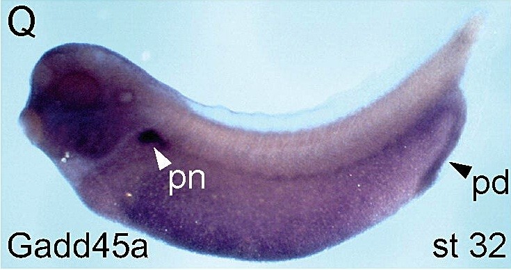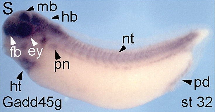 gadd45b (growth arrest and DNA-damage-inducible, beta ) gene expression in Xenopus laevis embryo via in situ hybridization, NF stage 32 lateral view, anterior left, dorsal up.