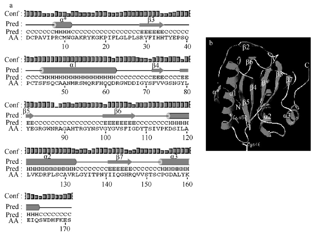 a) 2-D structure of XtPGRP-L. The conserved structures for all PGRPs are indicated as α1-3 and α3-7. The α* is the specific region of XtPGRP-L. b) The 3-D