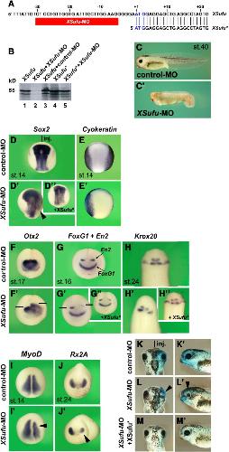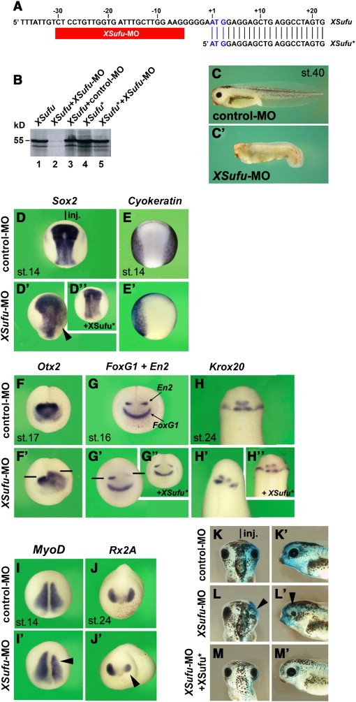 Fig. 4. Depletion of XSufu induces expansion of the neural plate, stimulates anterior neural markers and suppresses eye development. (A) Targeting sequence of the XSufu morpholino oligonucleotide (XSufu-MO). The non-targeted XSufu* mRNA construct lacks the 5â² untranslated region. Blue letters indicate start codon. (B) In vitro transcriptionâtranslation assay. The XSufu-MO, but not an unspecific control-MO, inhibits XSufu protein synthesis. XSufu-MO does not reduce translation of XSufu* mRNA. (C,Câ²) At the tadpole stage, XSufu-MO-injected embryos have reduced head and tail structures. (DâDâ²) Dorsal view of early neurula embryos. Injection was performed animally into one blastomere at the 2-cell stage together with nlacZ mRNA as tracer. XSufu-MO, but not control-MO, causes expansion of Sox2 expression on the injected side (arrowhead); this effect is reverted by co-injection with XSufu* mRNA. (E,Eâ²) XSufu-MO leads to a reduction of Cytokeratin expression. (FâH,Fâ²âHâ²,Gâ²,H'') Anterior view of neurula (F,Fâ²,GâGâ²) and dorsal view of tailbud embryo (HâHâ²). XSufu-MO causes expansion of Otx2, reduced intensity of En2, and a posterior shift of En2 and Krox20 expression, while FoxG1 expression remains unaffected. Co-injection of XSufu-MO and XSufu* mRNA rescues normal En2 and Krox20 expression. (I,Iâ²) Dorsal view of early neurula. XSufu-MO induces reduction of MyoD expression (arrowhead). (J,Jâ²) Anterior view of tail bud embryo. XSufu-MO leads to a reduction of Rx2A expression. (KâM,Kâ²âMâ²) A single injection of XSufu-MO causes reduction of eye structures (arrowheads), which is reverted by co-injection of XSufu* mRNA. The indicated phenotypes were observed in: C, 70/83; Câ², 21/43; J, 22/24; D, 50/50; Dâ², 71/77; Dâ², 82/87; E, 24/27; Eâ², 39/40; F, 23/24; Fâ², 20/20; G, 39/39 (FoxG1), 55/55 (En2); Gâ², 42/42 (FoxG1), 54/54 (En2); Gâ², 31/31; H, 65/67; Hâ², 79/79; Hâ², 34/40; I, 24/26; Iâ², 27/28; J, 40/42; Jâ², 67/73; L,Lâ², 25/25; M,Mâ², 21/43.