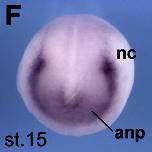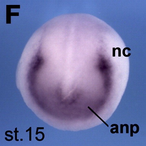 sufu (suppressor of fused homolog) gene expression in Xenopus laevis embryo via in situ hybridization, NF stage 15, anterior view, dorsal up.