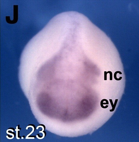 sufu (suppressor of fused homolog) gene expression in Xenopus laevis embryo via in situ hybridization, NF stage 23, anterior view, dorsal up.