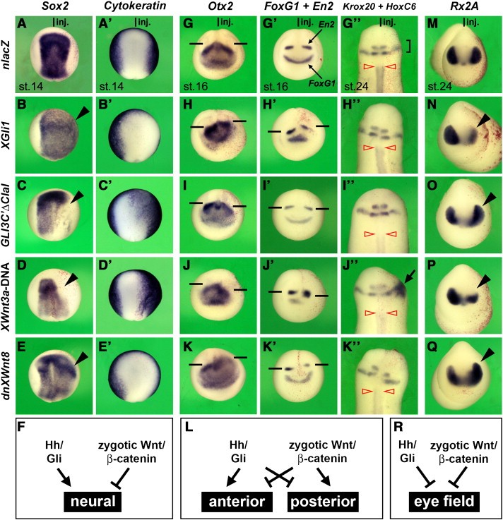 Fig. 1. Function of Hh and Wnt signals during neural induction, anteroposterior patterning and eye field development. Xenopus embryos were injected into the animal pole of a single blastomere at the 4-cell stage with the indicated constructs and nlacZ mRNA as a lineage tracer (red nuclei on injected right side). (A,Aâ²) Control late gastrula in dorsal view depicting the neural plate marker Sox2 and the epidermal marker Cytokeratin. (B,Bâ²,C,Câ²) XGli1 mRNA expands neural at the expense of epidermal tissue, while Gli3Câ²Î´ClaI mRNA causes the opposite effect. (D,Dâ²,E,Eâ²) XWnt3a DNA promotes epidermal and dnXWnt8 mRNA neural development. (GâGâ²) Control embryos at neurula stage in anterior view (G,Gâ²) and at tail bud stage in dorsal view (Gâ²). Otx2 demarcates the developing cement gland, forebrain and midbrain (horizontal line), FoxG1 the telencephalon, En2 the posterior midbrain, and Krox20 the hindbrain rhombomeres 3 and 5 (bracket). Open arrowhead points to the anterior border of HoxC6 expression in the spinal cord. (HâHâ²,IâIâ²) XGli1 mRNA anteriorizes the brain, whereas Gli3Câ²Î´ClaI causes very subtle posteriorization. (JâJâ²) XWnt3a DNA has posteriorizing activity. The arrow points to an expansion of Krox20 expression in neural crest cells. (KâKâ²) dnXWnt8 mRNA leads to anteriorization. (M) Control tail bud embryo in anterior view, showing Rx2A expression in the bilateral eyes. (NâO) XGli1 mRNAs diminish, whereas Gli3Câ²Î´ClaI mRNAs expand the eye anlage. (P,Q) XWnt3a DNA leads to a smaller and dnXWnt8 mRNA to a larger eye anlage. (F,L,R) Summary of effects of Hh and zygotic Wnt signals on neural induction (F), anteroposterior patterning (L), and specification of the eye field (R). The indicated gene expression patterns were obtained in: B, 43/46; Bâ², 24/26; C, 48/49; Câ², 41/52; D, 36/40; Dâ², 17/19; E, 57/57; Eâ², 64/68, H, 9/10; Hâ², 12/12 (FoxG1), 8/12 (En2); Hâ², 7/7 (Krox20), 11/11 (HoxC6); I, 11/13; Iâ², 18/20 (FoxG1), 15/20 (En2); Iâ², 17/26 (Krox20), 45/49 (HoxC6); J, 44/44; Jâ², 34/34 (FoxG1), 29/34 (En2); Jâ², 43/50 (Krox20), 12/17 (HoxC6); K, 42/45; Kâ², 37/37 (FoxG1), 29/37 (En2); Kâ², 15/15 (Krox20), 13/13 (HoxC6); N, 8/10; O, 17/20; P, 8/9; Q, 11/11 (Rx2A).