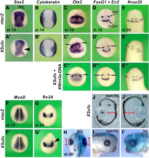 Fig. 3. Microinjection of XSufu mRNA suppresses neural plate formation, stimulates anterior neural markers and promotes eye development. Embryos were animally injected at the 4-cell stage with nlacZ mRNA as control or XSufu mRNA. All specimens were injected into a single blastomere. Embryos are shown in dorsal (A,Aâ²,B,Bâ²,EâEâ²,F,Fâ²,H), anterior (CâCâ²,DâDâ²,G,Gâ²), lateral views (I,Iâ²), or as transversal section (J,Jâ²). (A,B,Aâ²,Bâ²) XSufu mRNA causes reduction of Sox2 and concomitant expansion of Cytokeratin expression on the injected right side (arrowhead). (CâE,Câ²âEâ²) XSufu mRNA causes posteriorward expansion of Otx2 expression and a posterior shift of En2 and Krox20 expression, while FoxG1 expression remains unaffected. (Câ²âEâ²) Co-injection of XSufu mRNA and Wnt3a DNA restores normal expression of Otx2, En2, and Krox20. (F,Fâ²) XSufu mRNA has no effect on MyoD expression upon animal injection. (G,Gâ²,HâJ,Iâ²,Jâ²) XSufu mRNA leads to an enlargement of Rx2A expression, enlarged eye structures and expansion of the neural retina. Frequency of embryos with the indicated phenotype was: Aâ², 44/46; Bâ², 61/62; Câ², 7/10; Câ², 12/12; Dâ², 46/51; Dâ², 19/21; Eâ², 116/125; Eâ², 32/40; Fâ², 19/21; Gâ², 95/108; H, 56/115.